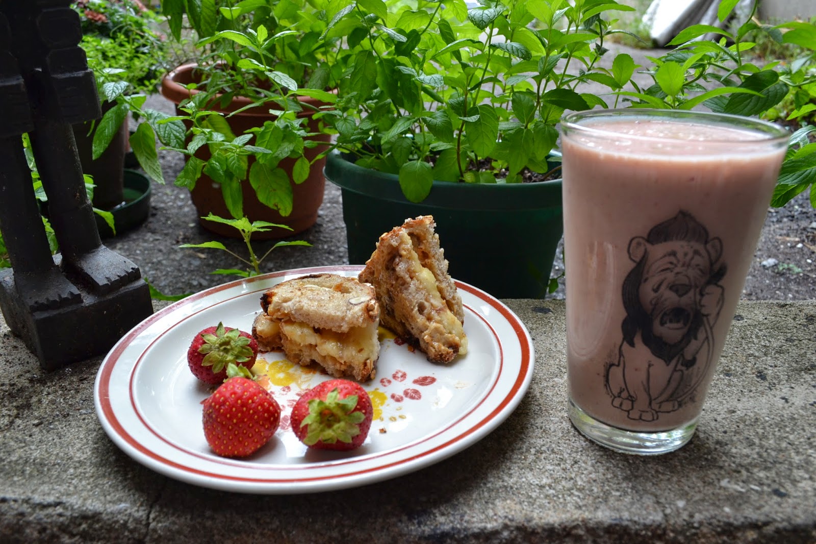| Un sandwich grillé au beurre d'arachides et bananes, dans un pain aux noisettes et raisins, accompagné d'un smoothie pêche, fraises, banane. |